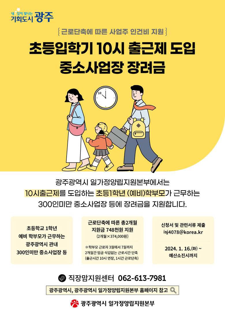 - 학부모들 큰 호응에 건수·지원액 확대…16일부터 선착순 접수 [광주 세계타임즈=손권일 기자] 광주광역시 일가정양립지원본부는 2024년 ‘초등입학기 10시 출근제 도입 중소사업장 장려금 지원사업’에 참여할 중소사업장을 오는 16일부터 선착순 모집한다.
