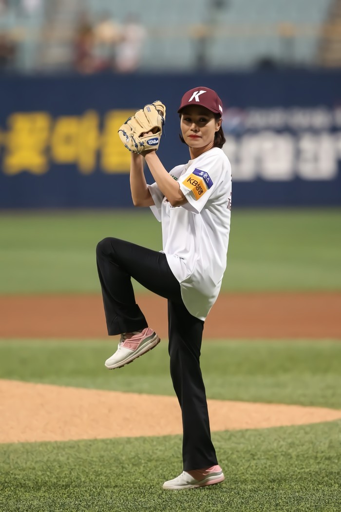 | ▲에실로코리아 소효순 대표가 시구를 하고 있다.(사진제공=키움히어로즈) |