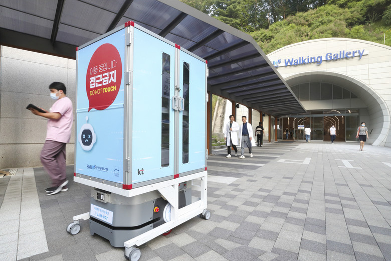 5G 융합서비스 중 ‘자동이송 로봇(AMR, Autonomous Mobile Robot)’은 의료 재료, 약품, 린넨(환자 옷, 침대 시트, 이불 등) 등 수술과 진료에 필요한 물품을 자동으로 이송한다. 물품은 분당서울대병원 본관에서 직선으로 약 300m 떨어진 헬스케어혁신파크에서 온다. 분당서울대병원은 두 건물을 연결하는 터널인 ‘워킹갤러리’에 AMR 6대를 활용한 무인 이송 체계를 구축했다.