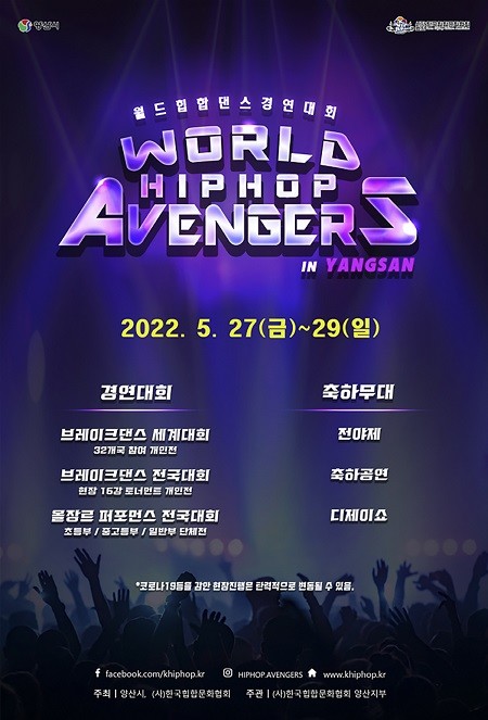 ‘2022 양산 월드 힙합 어벤져스’는 2024년 파리올림픽 정식종목으로 선정된 브레이크댄스 및 힙합 올장르의 댄스 경연대회로 세계부문과 국내부문으로 나누어 5월 27일부터 5월 29일까지 3일 동안 양산시 황산공원 내 특설무대에서 진행될 예정이다.