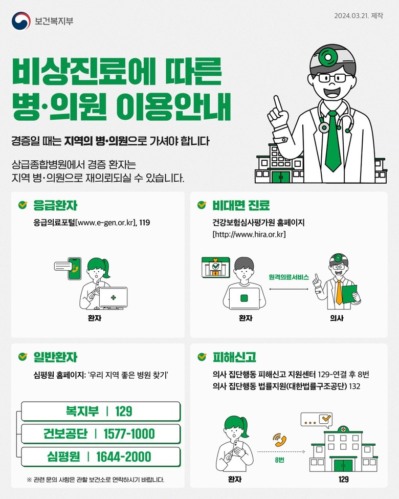 손옥수 복지건강국장은 “전공의 이탈 등으로 남아있는 의료진의 피로가 심한 상급종합병원은 중증·응급환자진료에 집중해 의료진의 소진을 방지해야 한다”며 “경증환자는 동네 병의원에서 진료를 받아주기를 당부드린다”고 말했다.