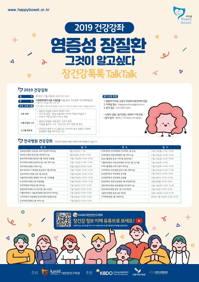 ‘2019 염증성 장질환 건강강좌 - 장건강톡톡’은 염증성 장질환에 대한 이해를 높이고 유용한 정보를 제공하며, 환우들과 의료진이 친밀하게 상담할 수 있는 소통의 계기를 마련해 질환으로 어려움을 겪는 환자와 가족들에게 실질적으로 도움이 되는 의미 있는 시간을 만들고자 기획된 행사다.