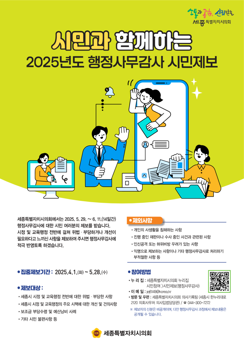 제보에는 ▲세종특별자치시의회 누리집(시민참여 → 시민제보) ▲이메일(jej6149@korea.kr) ▲방문 및 우편(세종특별자치시 한누리대로 2120, 의회사무처 2층 의사입법담당관) 등을 통해 참여할 수 있다.
