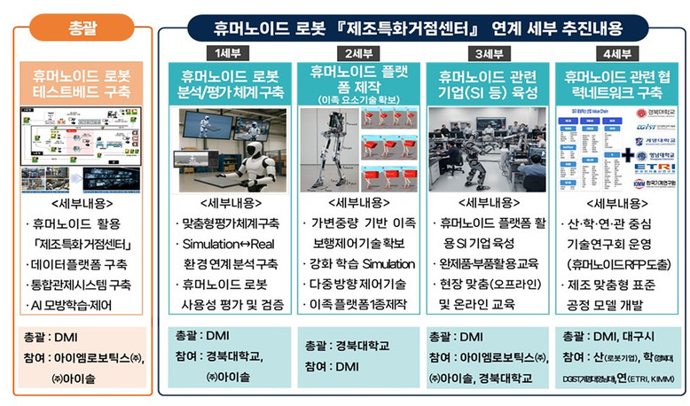 또한, 휴머노이드 로봇을 활용한 SI기업**을 적극 육성하고 데이터플랫폼 구축 및 이족보행 제어기술을 확보하는 한편 기업·대학·연구기관 협력 네트워크 구축을 통해 휴머노이드 로봇을 지역 제조산업의 핵심 경쟁력으로 성장시킬 계획이다.