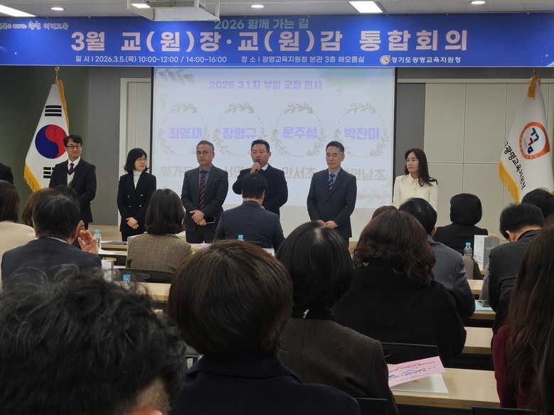[광명시 세계타임즈=송민수 기자] 경기도광명교육지원청(교육장 김명순)은 3월 5일(목), 광명교육지원청 3층 해오름실에서 2026 해오름 광명교육과 경기미래교육 구현을 위한 ‘2026년 3월 교(원)장, 교(원)감 통합회의’를 운영하였다. 이번 통합회의는 학년 초 학교와 교육지원청, 도교육청 간의 협력을 강화하고, 학교 중심의 교육정책, 미래장학, 교육과정운영의 선순환 체제를 통해 학교 중심 행정 지원의 기틀을 마련하고자 진행되었다.