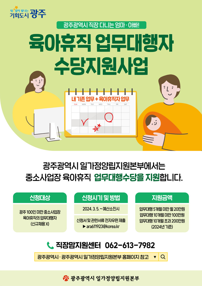 광주시는 ‘육아휴직 업무대행수당’이 고용노동부의 전국 표준모델로 자리잡아 2025년부터는 전국 모든 육아휴직 업무대행자들이 수당을 받을 수 있을 것으로 전망하고 있다.