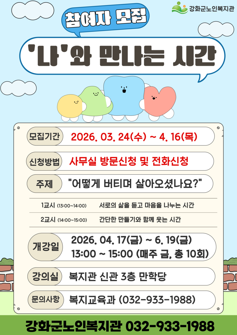 프로그램 신청 및 기타 자세한 사항은 강화군노인복지관(☎032-933-1988)으로 문의하면 된다.