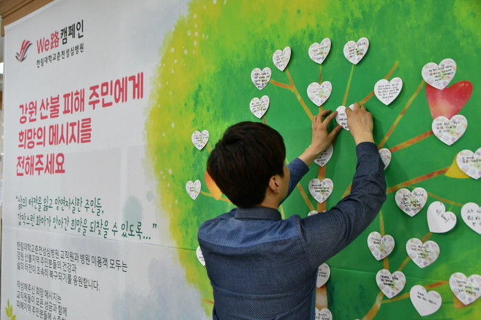 한림대춘천성심병원은 이번 산불피해에 대해 많은 직원들이 가족처럼 안타까워하는 마음이 컸고 해당 지역주민을 도울 수 있는 방법을 찾다가 병원 직원들이 자발적으로 모금운동을 계획했다고 밝혔다.