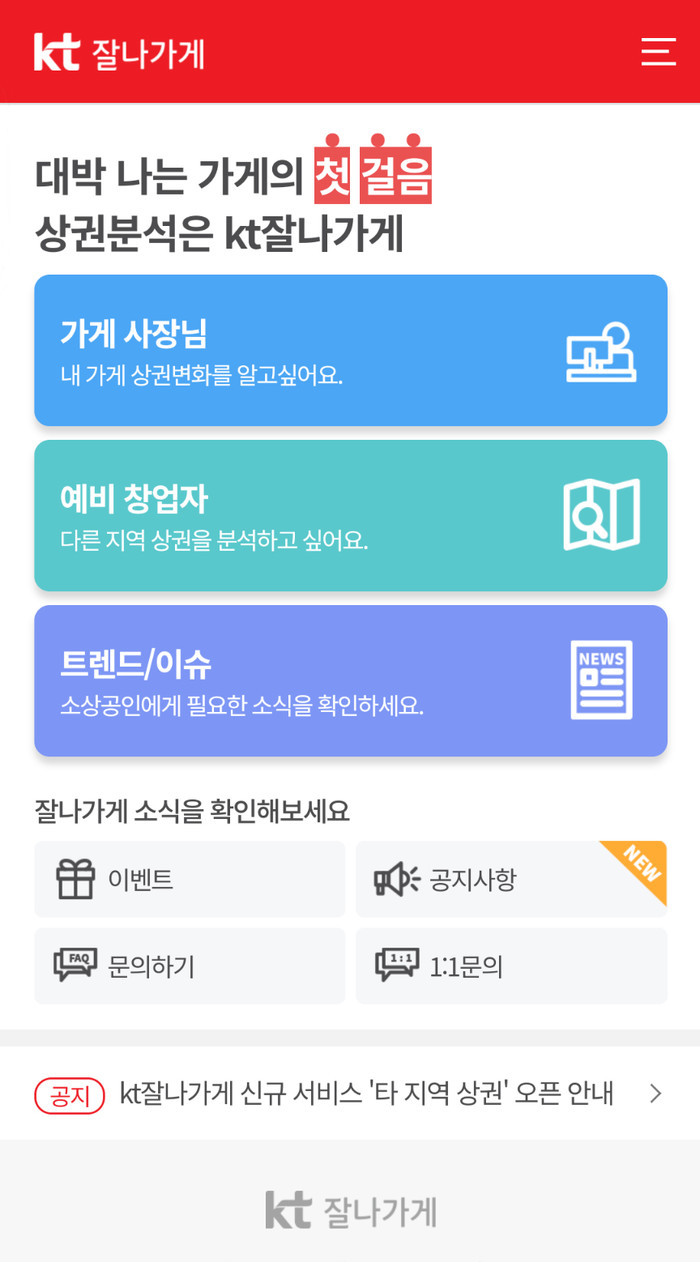 KT AI/BigData사업본부장 최준기 상무는 “소상공인을 위한 빠르고 쉬운 빅데이터 상권분석 서비스인 잘나가게가 예비창업자를 위한 ‘타지역상권’ 서비스를 오픈하고, 네이버 부동산과의 서비스 연동도 시작했다”며, “앞으로도 소상공인에게 가장 필요하고 도움이 되는 정보를 제공하겠다”고 말했다.