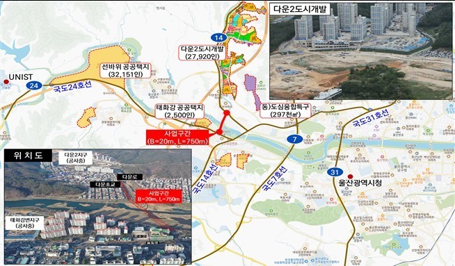▲다운~굴화 연결도로는 출퇴근 시간대 북부순환도로 일대 교통 집중과 다운2지구, 태화강변 공공주택지구 개발에 따른 교통량 증가에 대비한 우회도로 개설사업이다.
