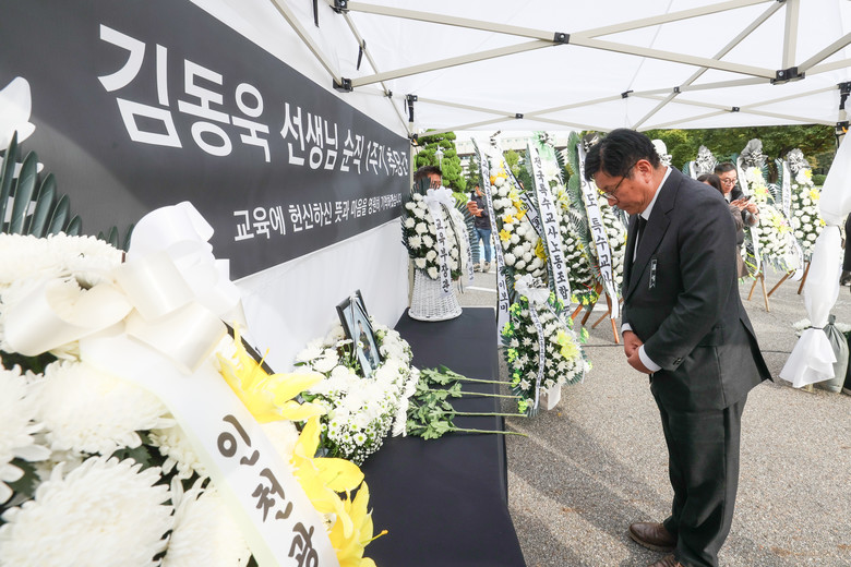 [인천 세계타임즈=심하린 기자] 인천광역시교육청(교육감 도성훈)은 21일 시교육청 본관 앞 추모공간에서 故 김동욱 선생님의 순직 1주기 추모식을 진행했다.