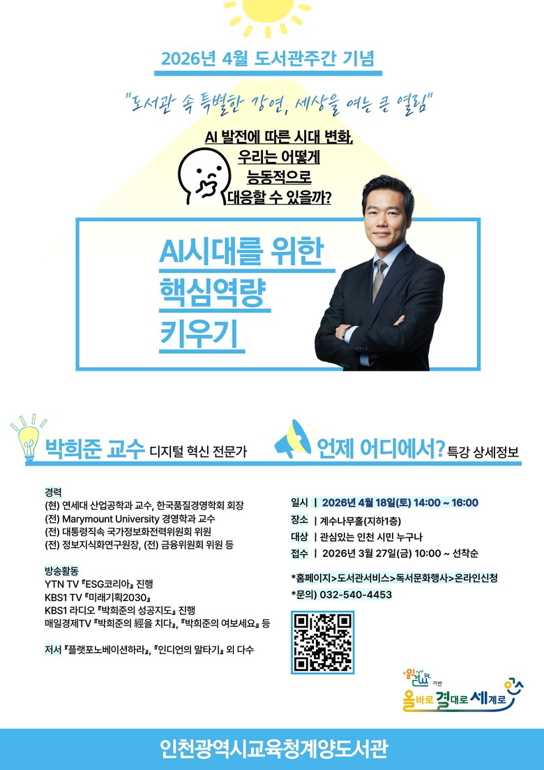 강연에서는 디지털 혁신 분야의 권위자인 연세대학교 산업공학과 박희준 교수가 AI 시대를 능동적으로 마주하고 대응할 수 있는 구체적인 핵심 역량과 해법을 제시할 예정이다.