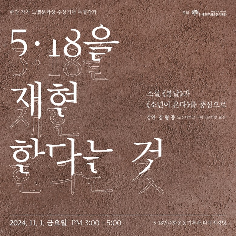 김형중 교수는 ‘5‧18을 재현한다는 것-소설 봄날과 소년이 온다를 중심으로’를 주제로, 임철우 작가의 ‘봄날’과 한강 작가의 ‘소년이 온다’ 속 5‧18의 재현과 표현형식 등 서술 관점에 대해 강연할 예정이다.