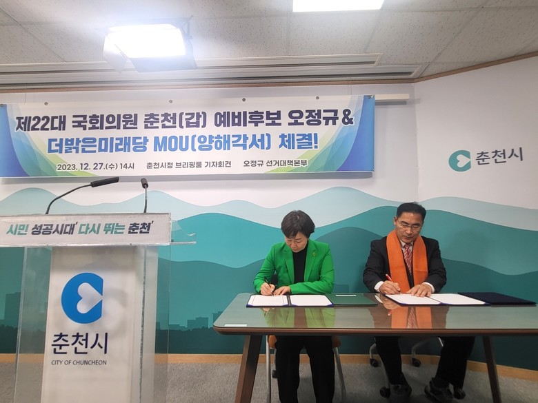 [세계타임즈]최성룡기자 = 더밝은미래당(대표 서정미)과 오정규 선거대책본부와 각계층 시민단체들은 지난 12월 27일(수) 14시 / 춘천시청 8층 브리핑룸에서 “양해각서 체결” 요지의 기자회견을 진행하였다.