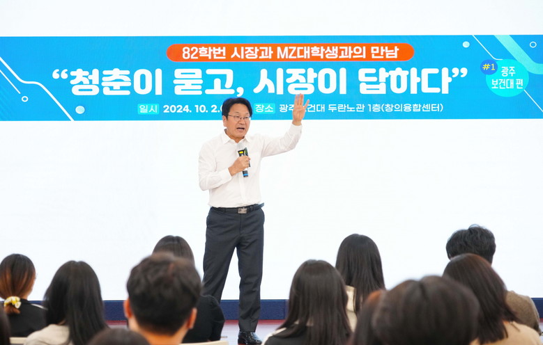 강기정 광주광역시장은 2일 광주보건대학교를 찾아 ‘청춘이 묻고 시장이 답하다’를 주제로 대학생들을 만났다.