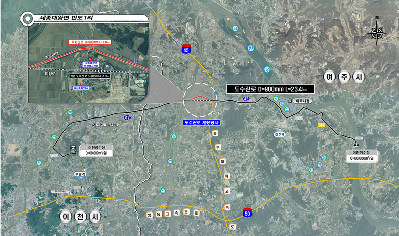 이 사업은 누수가 반복적으로 발생해 온 여주시 세종대왕면 (구)국도 구간의 기존 도수관로를 (현)국도42호선 인근으로 우회해 신규 관로를 설치하는 방식으로 추진됐다.