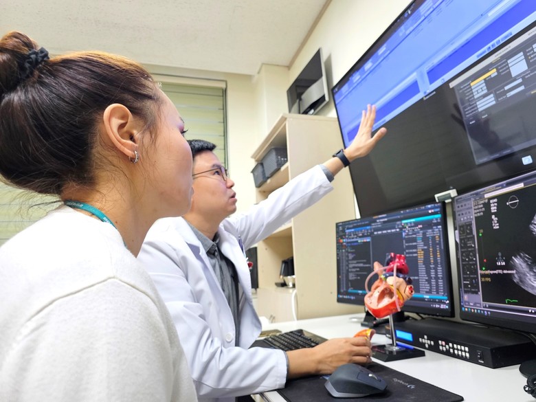 | ▲분당제생병원 심장혈관센터 오민석 과장이 몽골 제4병원 심장혈관내과 연수의 난살마 앵흐바트에게 심장초음파 교육을 하고 있다.(사진=분당제생병원) |