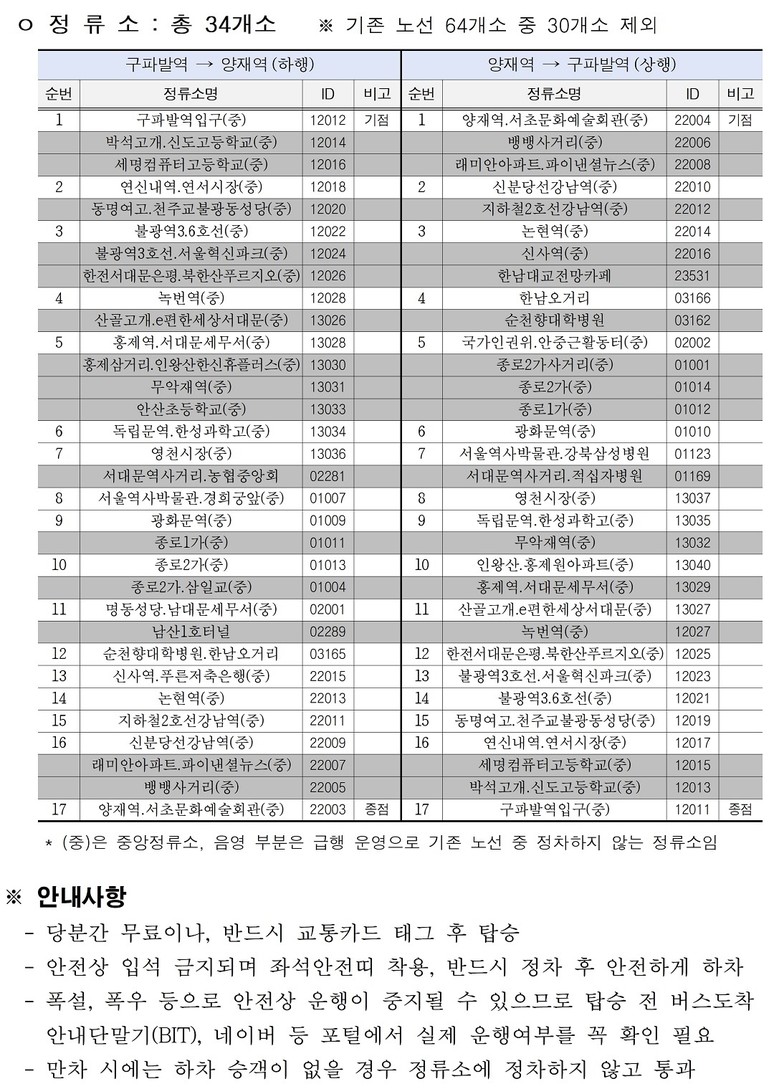 특히 이번 노선은 주요 정류소에만 정차하는 급행 시스템이 도입됐다. 기존 741번의 일부 구간을 단축해 급행으로 운영되는 A741 노선은 평일(월~금) 새벽 3시 30분 구파발역에서 출발해 광화문역, 신사역, 강남역 등을 거쳐 양재역까지 23.5km 구간을 왕복 1회 운행한다.
