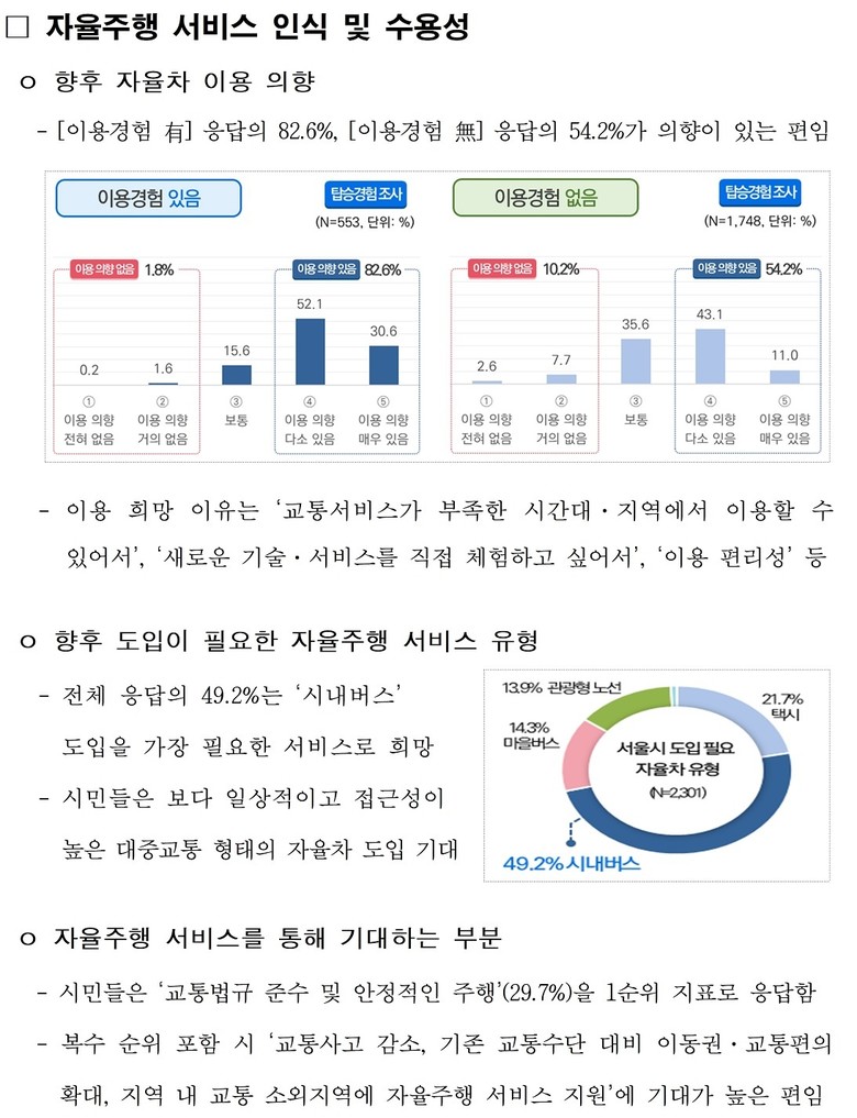 지난해 서울연구원이 서울시 자율주행 자동차 탑승객과 일반 시민 2,301명을 대상으로 실시한 조사에서 서울시에서 운영 중인 자율주행 자동차를 이용해 본 탑승객의 73.8%가 서비스에 ‘만족’(만족도 평균 3.9점/5점)하고, 82.6%가 향후 재이용 의사를 밝혔다. A160 노선의 서비스 만족도는 평균 4.08점으로 대부분의 이용객으로부터 높은 평가를 받았다.