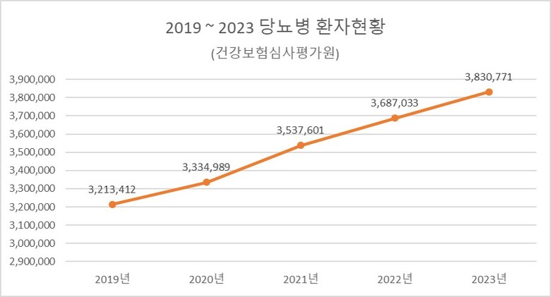 건강보험심사평가원에 따르면 2019년 3,213,412명이었던 당뇨병 환자가 2023년에는 3,830,771명으로 최근 5년 사이 19%가 증가했다.