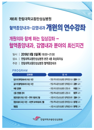 이번 연수강좌에서는 혈액종양내과와 감염내과 분야의 최신지견에 대한 다양한 강의가 열린다. 강의는 ▲한림대학교동탄성심병원 혈액종양내과 김병수 교수의 <림프계 혈액암에서의 최신지견>과 <골수계 혈액암에서의 최신지견> ▲한림대학교동탄성심병원 감염내과 우흥정 교수의 <여행 감염학> ▲한림대학교동탄성심병원 감염내과 정은주 교수의 <신종 전염병 관리> ▲한림대학교동탄성심병원 혈액종양내과 김병수 교수의 <항암치료의 최신지견 - 면역치료제 근황> ▲한림대학교동탄성심병원 혈액종양내과 정주영 교수의 <항암치료의 최신지견 - 비면역 표적치료제 근황> 등의 순서로 진행된다.