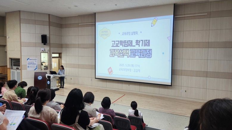 이번 설명회는 고교학점제와 대입 제도의 변화 속에서 학부모의 이해도를 높이고, 학생 맞춤형 진로·학습 설계를 지원하기 위해 마련되었으며, 1부와 2부로 나누어 ▲ 2022 개정 교육과정 ▲ 우리학교 교육과정 ▲ 교과별 선택과목 ▲ 고교학점제 소개 ▲ 2028 대입제도 개편안 ▲ 1학년 맞춤형 학습 및 진로 전략 등을 종합적으로 안내했다.