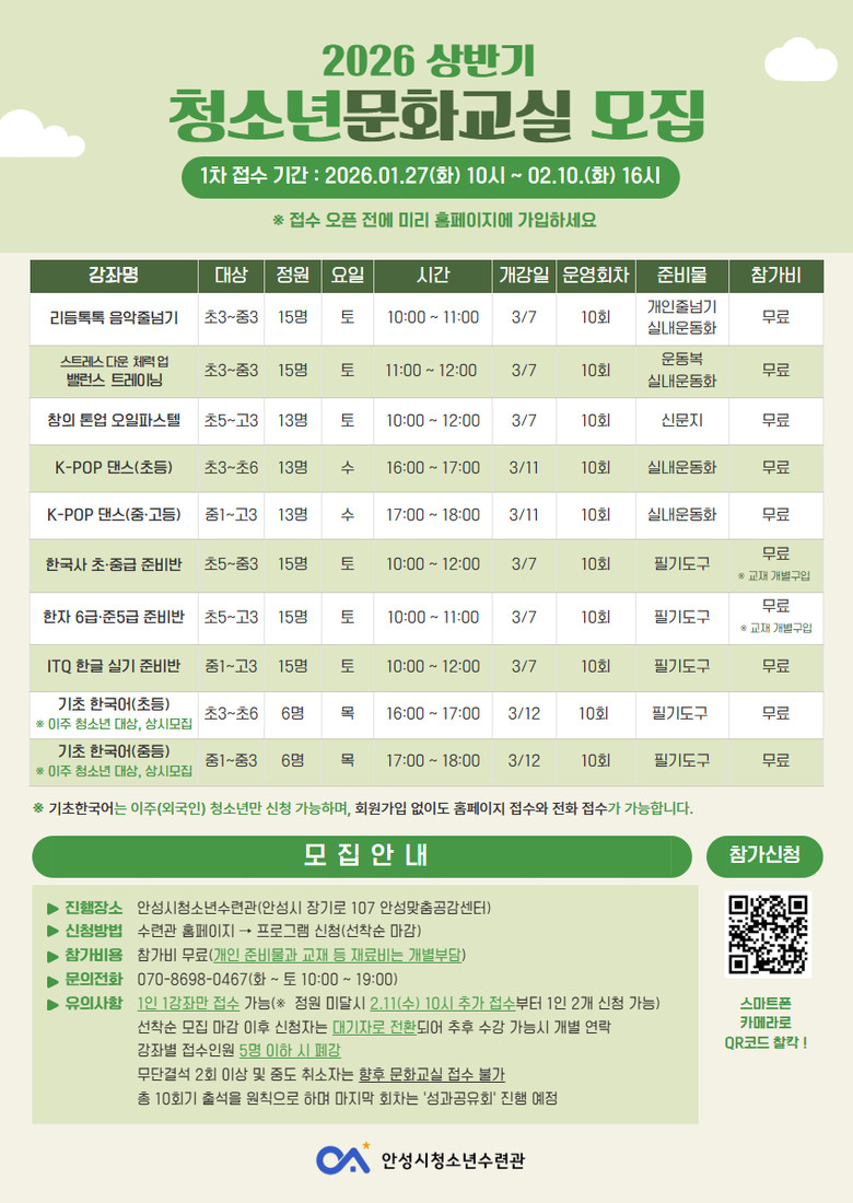 안성시에 거주하는 청소년이라면 누구나 신청할 수 있으며, 강좌별 상세 일정 확인 및 접수는 안성시청소년수련관 홈페이지(https://www.asyc.or.kr)를 통해 가능하다