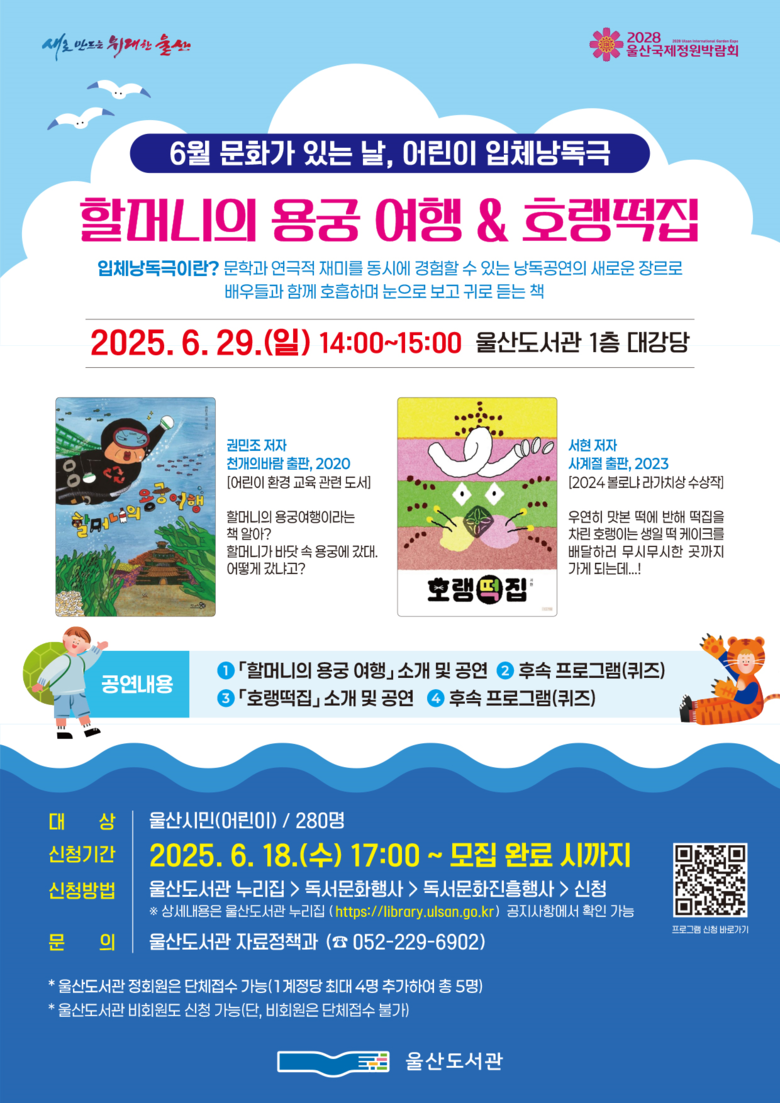 18일부터 도서관 누리집서 선착순 280명 접수 [울산 세계타임즈=이호근 기자] 울산도서관은 6월 문화가 있는 날을 맞아 오는 6월 29일 일요일 오후 2시 도서관 1층 대강당에서 어린이 입체낭독극 ‘할머니의 용궁 여행 & 호랭떡집’ 공연을 선보인다고 밝혔다.