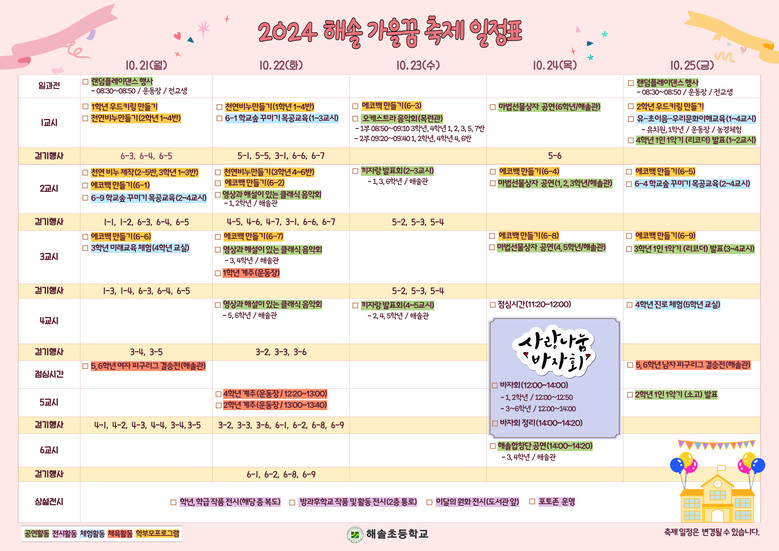 [파주시 세계타임즈=송민수 기자] 해솔초등학교(교장 최순월)는 10월 21일부터 5일간 ‘해솔 가을꿈 축제’주간을 운영한다. 축제명도 학생들이 공모에 참여하였고, 교사, 학부모 공동체 모두의 투표를 통해 선정하였다. 축제주간에 운영하는 모든 프로그램도 한 해동안의 교육활동 결과로, 학생들이 직접 기획하고 참여할 수 있도록 하였다.