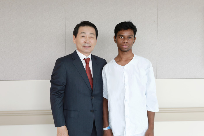 | ▲자생의료재단 박병모 이사장(왼쪽)과 방글라데시 청년 피터가 사진 촬영을 하고 있다. |