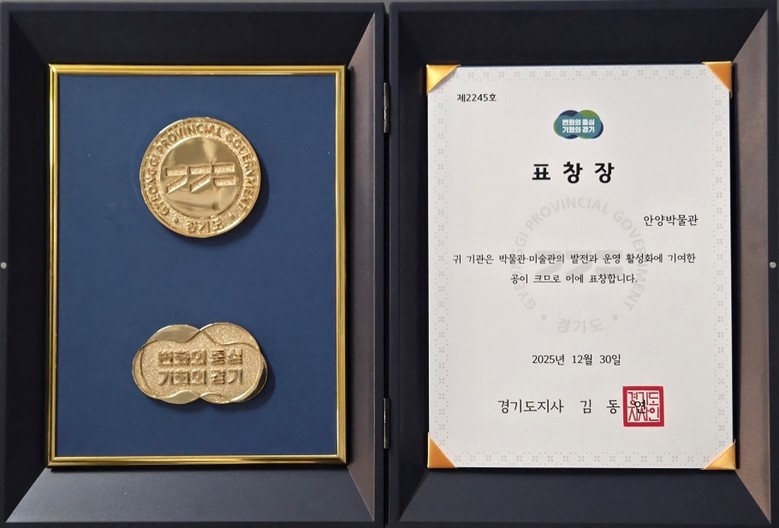 이번 표창은 ‘경기도 포상 조례’에 따라 경기도 박물관·미술관 활성화에 기여한 단체를 대상으로 수여되는 상이다. 안양박물관은 2004년 개관 이후 지역 문화자원의 보존·수집은 물론 연구, 전시 및 교육 운영을 통해 박물관·미술관 발전에 기여한 공로를 인정받아 표창 대상자로 선정됐다.