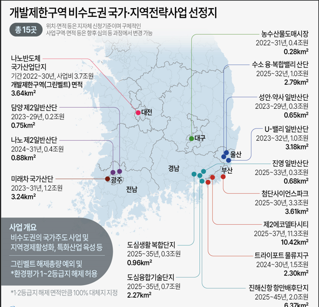 [세계타임즈 = 심귀영 기자] 정부가 비수도권 지역전략사업 15곳 조성을 위해 여의도 면적 15배 규모 개발제한구역(그린벨트)를 해제한다.그린벨트를 풀어 부산에서는 제2에코델타시티와 해운대 첨단사이언스파크, 대전에선 나노반도체·우주항공 국가산업단지를 만든다.