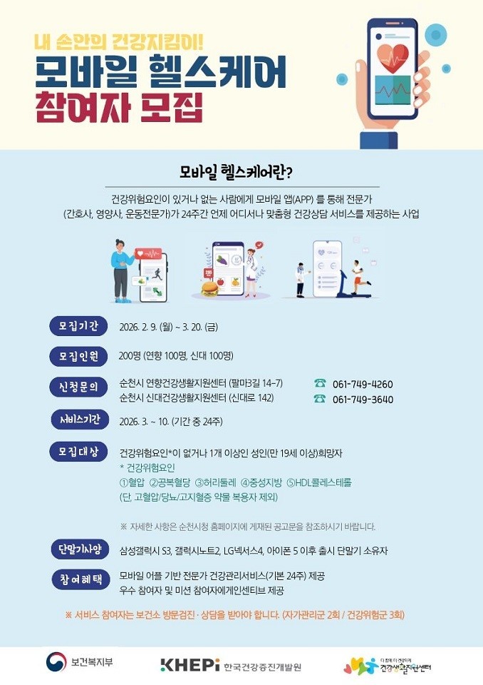 기타 자세한 사항은 연향 건강생활지원센터(061-749-4260)와 신대 건강생활지원센터(061-749-3640)로 문의하면 된다.
