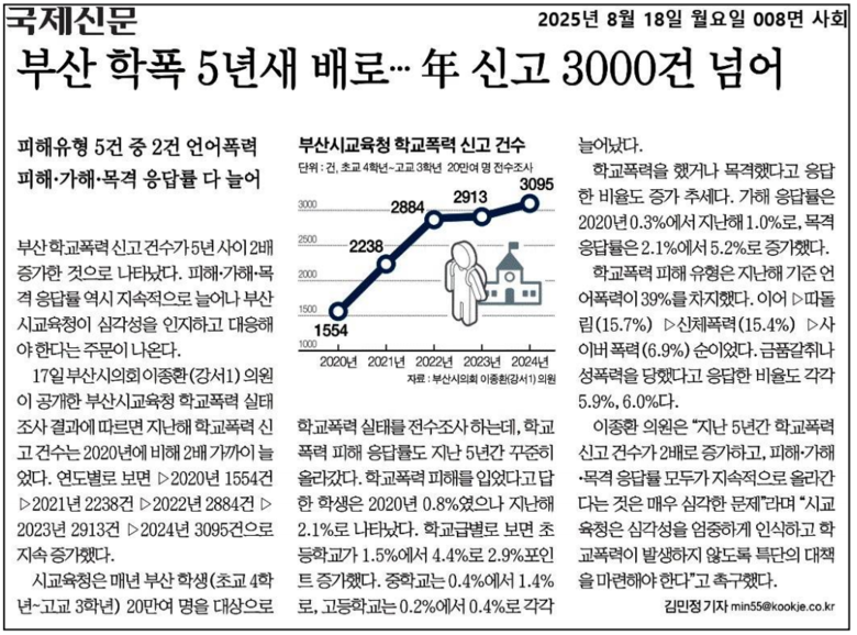 끝으로 이준호 의원은 “이번 조례 개정을 통해 학생들이 안전하고 존중받는 학교 환경을 조성하는 제도적 기반이 될 것”이라며, “부산형 학교폭력 대응 특화 모델이 실효성 있는 지원 체계로 자리잡기를 바란다 ”고 말했다.