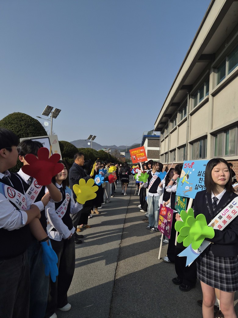 학생자치회 학생들은 피켓과 현수막을 활용해 등교하는 학생들을 맞이하며 안전한 등굣길 조성을 위한 메시지를 전달하였고, 밝은 인사와 함께 참여형 캠페인을 운영해 행사 분위기를 한층 활기차게 만들었다.