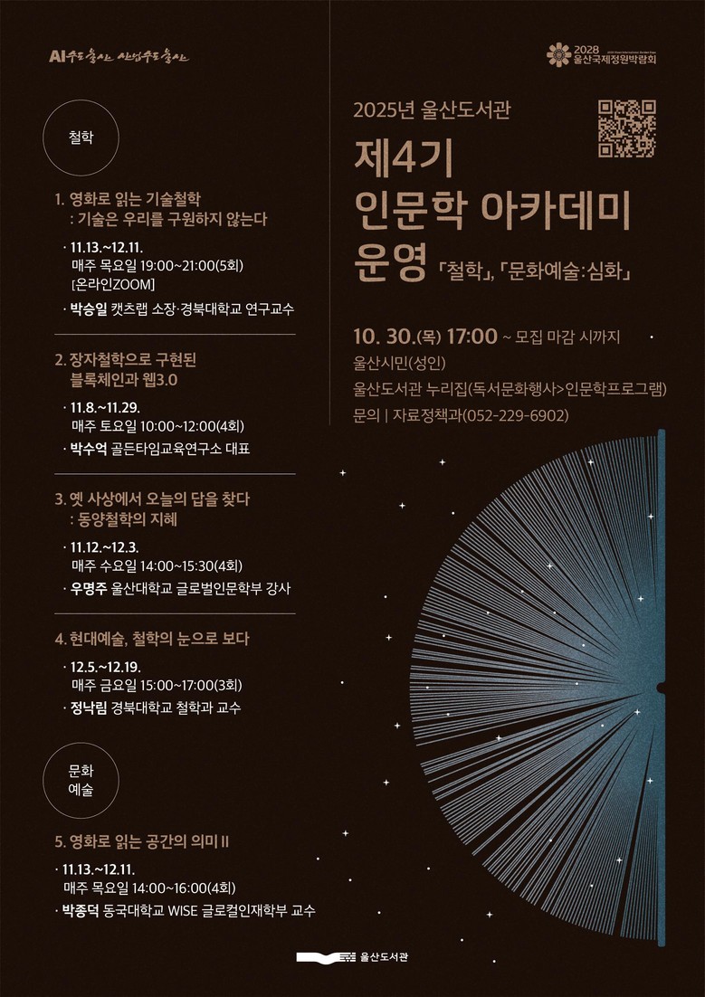 30일부터 울산도서관 누리집 선착순 접수 [울산 세계타임즈=이호근 기자] 울산도서관은 오는 11월부터 `‘2025년 제4기 인문학 아카데미’를 운영한다고 밝혔다.