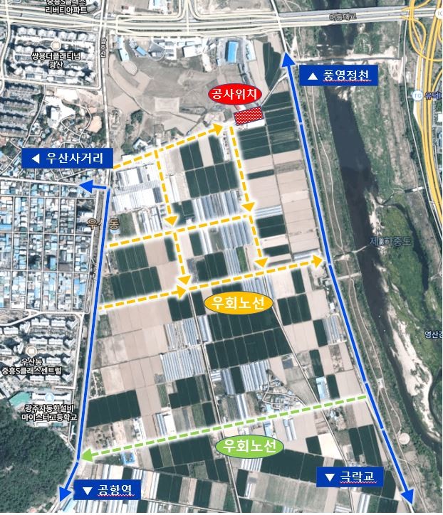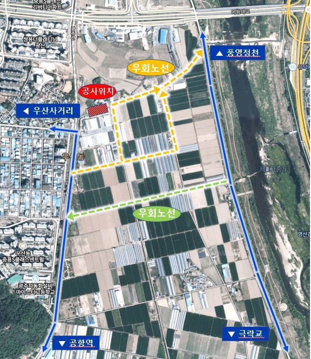 이번 공사구간(우산동 769-1~우산동 202-1번지)은 제수밸브실 등 상수도시설물을 설치하기 위해 도로 전체 폭 굴착이 불가피해 설치기간이 다소 소요될 것으로 예상된다. 이에 따라 해당 구간 차량 진입이 어려워 우회해야 한다. 광주상수도사업본부는 공사 종료까지 차량신호수와 안내간판 등을 배치해 교통불편 등을 최소화할 방침이다.