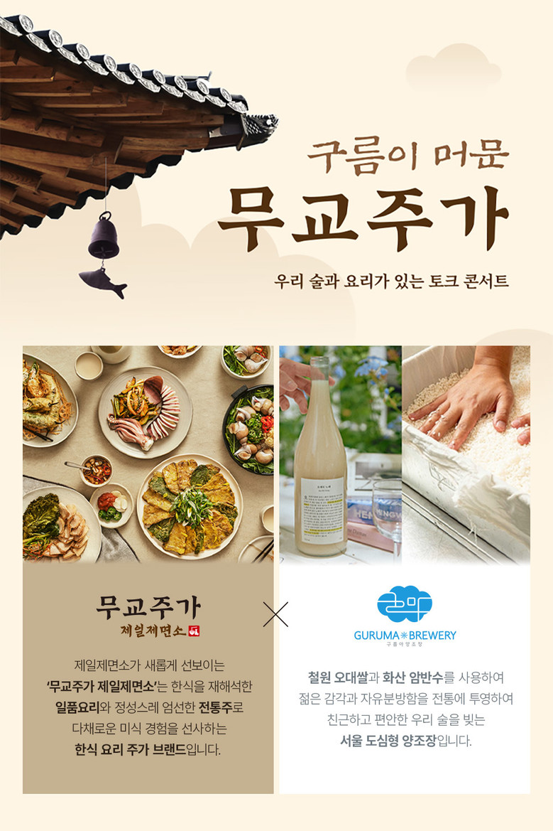 무교주가는 12월 16일 ‘구름아 양조장’과의 협업을 통해 ‘구름이 머문 무교주가’를 콘셉트로 한 전통주 페어링 토크 콘서트를 진행한다. 제일제면소의 콘셉트스토어인 무교주가는 한식을 재해석한 일품요리와 전통주로 다채로운 미식 경험을 선사한다. 무교주가는 다양한 한식 요리와 전통주를 함께 즐길 수 있는 매력적인 모임 장소로서의 경쟁력을 알리기 위해 전통주 분야에서 새로운 시도를 보여주는 구름아 양조장과 협업해 이번 행사를 기획하게 됐다고 설명했다.