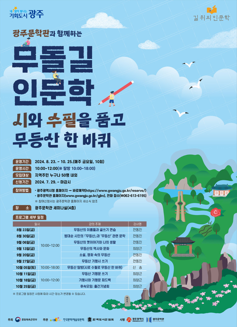 프로그램은 ▲무등산의 이름들과 글쓰기 연습 ▲범대순 시인의 ‘무등산’과 ‘무등산’ 관련 문학 ▲무등산의 옛이야기와 나의 생활 ▲무등산의 역사와 문화 등 10개 강좌로 운영되며, 8월 23일부터 10월 25일까지 매주 금요일 오전 10시 광주문학관 4층 세미나실에서 무료로 진행된다.