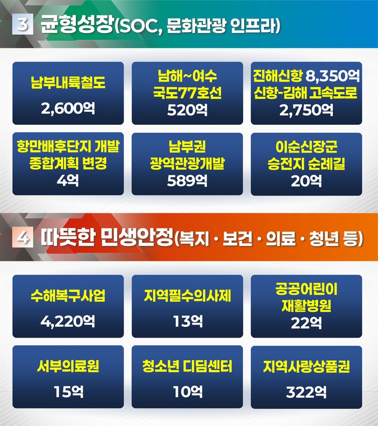 수도권과 서부경남의 접근성을 획기적으로 개선할 ‘남부내륙철도 건설’, 남해안 섬 연결 해상국도 완성을 위한 주요 구간인 ‘남해~여수 간 국도77호선 건설’ , 북극항로 시대의 중심이 될 ‘진해신항 건설’, ‘부산신항 김해 고속도로 건설’, ‘항만배후단지 개발 종합계획 변경 용역’ 등 도가 중점적으로 챙겨온 사회간접자본(SOC) 예산 대부분을 확보했다.