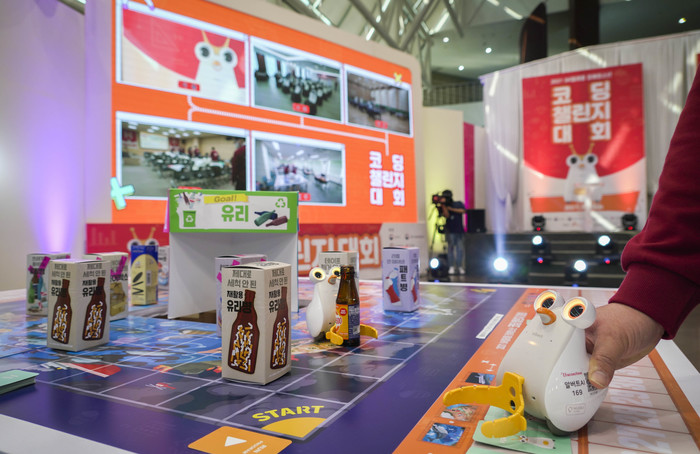 2인 1팀으로 구성된 학생들은 코딩 로봇 ‘알버트’에 명령 카드를 순차적으로 입력해 지구 모양의 경기장 위에 있는 재활용품(캔, 병, 플라스틱, 종이)를 각각의 수거 장소로 옮기는 과제를 수행하고, 가장 빨리 목표를 달성한 팀이 승리하게 된다.
