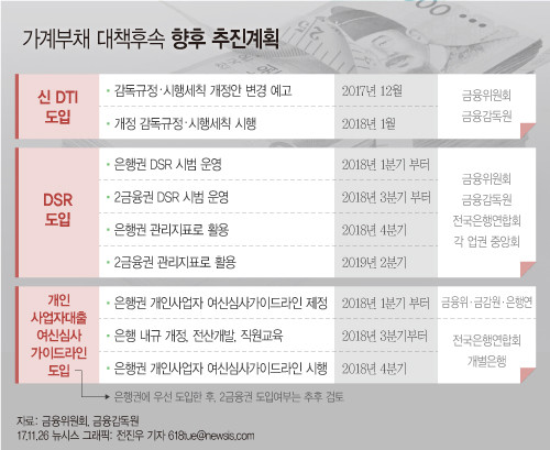 주택담보대출 뿐 아니라 마이너스 통장을 포함한 모든 대출의 원리금을 포함해 대출 한도를 산정하는 DSR이 내년 하반기 은행권부터 도입된다. 금융당국은 일단 은행들이 자율적 체계에서 운용토록 하는 시범 기간을 거친 뒤 내년 하반기 금융회사 관리지표로 도입한다는 계획이다.