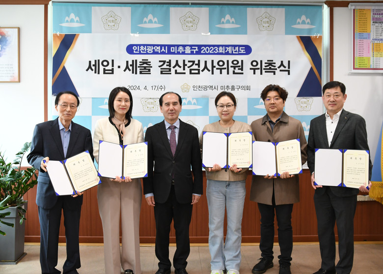 [미추홀구 세계타임즈=심하린 기자] 인천광역시 미추홀구 의회(의장 배상록)는 지난 17일 2023 회계연도 결산검사위원 위촉식을 개최하였다.