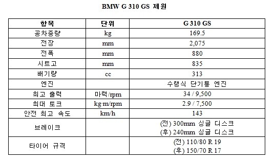BMW 뉴 G 310 GS는 앞서 출시한 G 310 R과 동일한 배기량 313cc의 수랭식 단기통 엔진을 탑재했다. 4개의 밸브와 2개의 오버헤드 캠샤프트, 후방으로 경사진 실린더, 전면 공기 흡입부를 갖추고 있으며 9,500rpm에서 최고출력 34마력, 7,500rpm에서 최대토크 2.9kg·m의 성능을 발휘한다. 이와 더불어 169.5kg의 가벼운 공차중량을 통해 더욱 역동적인 성능을 구현했다.