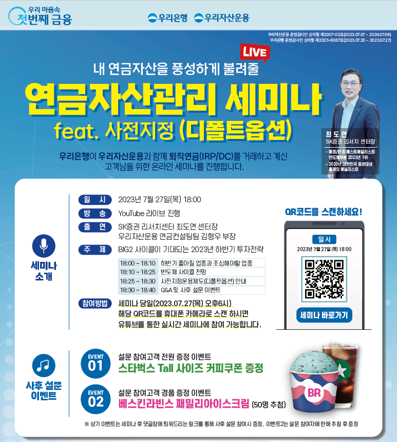 이번 세미나는 SK증권의 리서치 전문가가 출연해 하반기 시황과 유망 업종에 대한 투자전망을 제시하고, 우리자산운용의 연금컨설팅 전문가가 최근 유예기간이 종료되며 본격 시행된 사전지정운용제도(디폴트옵션)에 대해서도 설명할 예정이다.