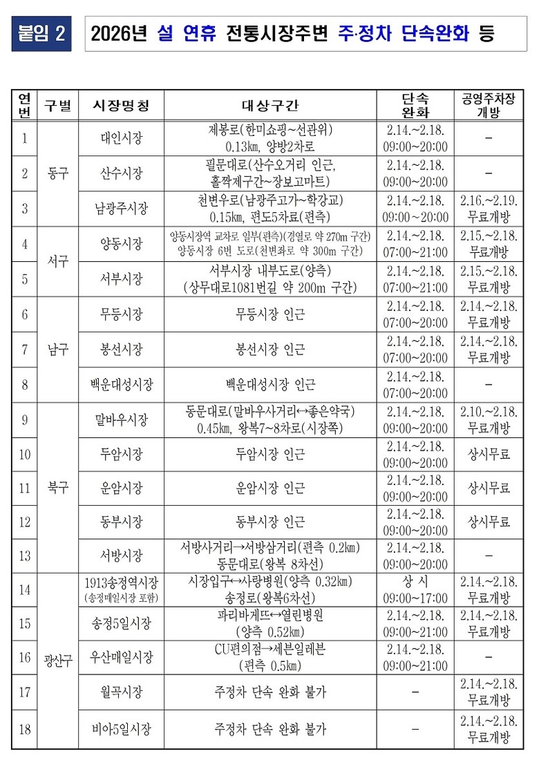 불법 주·정차 단속 완화 대상 전통시장은 ▲동구(대인·산수·남광주) ▲서구 (양동·서부) ▲남구(무등·봉선·백운대성) ▲북구(말바우·두암·운암·동부·서방) ▲광산구(1913송정역(송정매일 포함)·송정5일·우산매일) 등 총 16곳이다.