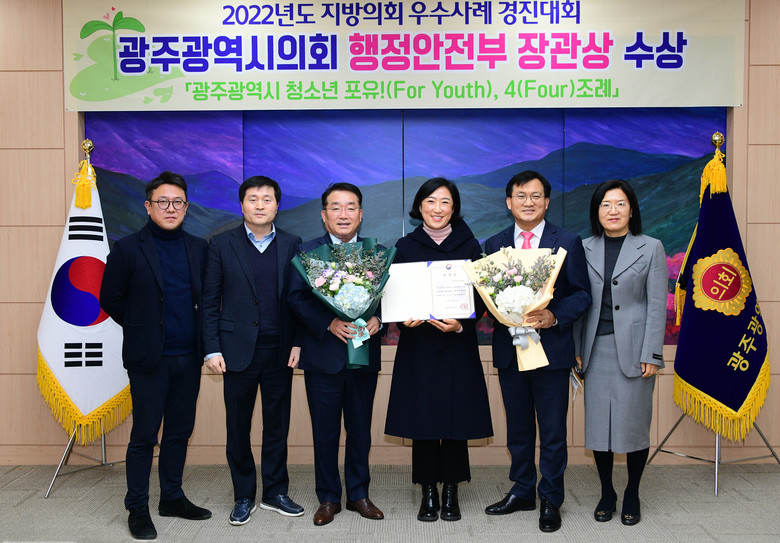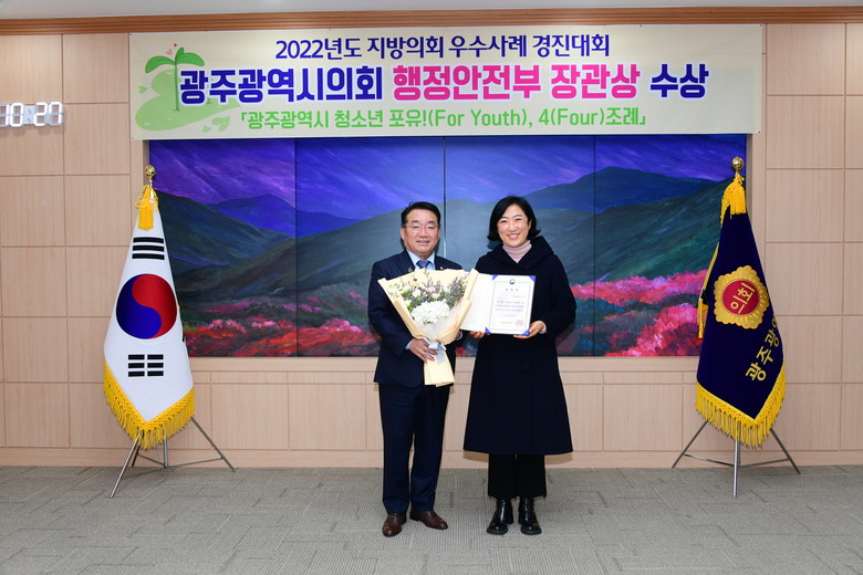 [광주 세계타임즈=손권일 기자] 정무창 광주광역시의회 의장은 2일 시의회 열린시민홀에서, 2022년도 행안부 주최 ‘지방의회 우수사례경진대회’ 결과 ‘광주광역시 청소년 포유!(For Youth), 4(Four)조례’로 우수상을 받고 발의자인 신수정 의원에게 상장을 전수했다.