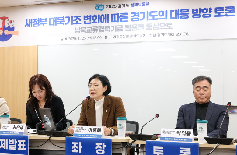 [경기도 세계타임즈=송민수 기자] 경기도의회 기획재정위원회 이경혜 부위원장(더불어민주당, 고양4)이 좌장을 맡은 「새정부 대북기조 변화에 따른 경기도의 대응방향 토론회: 남북교류협력기금 활용을 중심으로」가 11월 25일(화) 경기도의회 중회의실2에서 개최됐다. 이번 토론회는 경기도와 경기도의회가 공동 주최하는 ‘2025 경기도 정책토론회’의 일환으로 마련됐다.