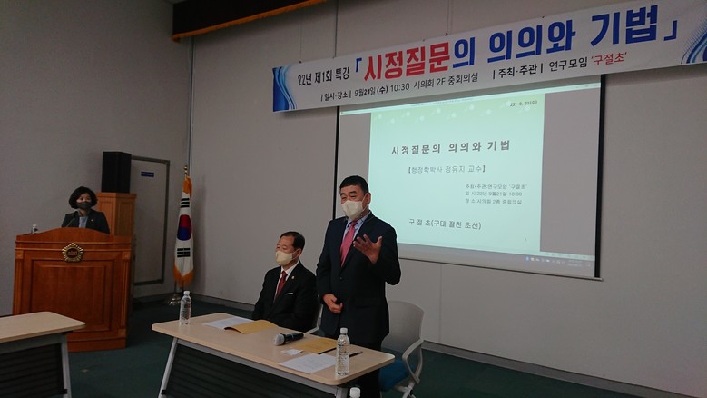 [부산 세계타임즈=이용우 기자] 제9대 부산시의회 의원연구단체 ‘구절초(구대 절친 초선)’에서는 본회의에서 의원들이 가지는 권리인 발언권의 전문성을 높이고자 전문가를 초청하여 「시정질문의 의의와 기법」 강연회를 개최했다.