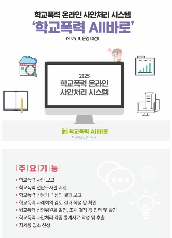 이정선 교육감은 “이번 학교폭력 All바로 시스템 도입으로 학교현장의 업무절차 간소화와 신속한 학교폭력 사안처리가 기대된다”며 “학교폭력을 올바르게 바라보고 학교 현장을 지원하여 건전한 교육환경 조성에 최선을 다하겠다”고 밝혔다.